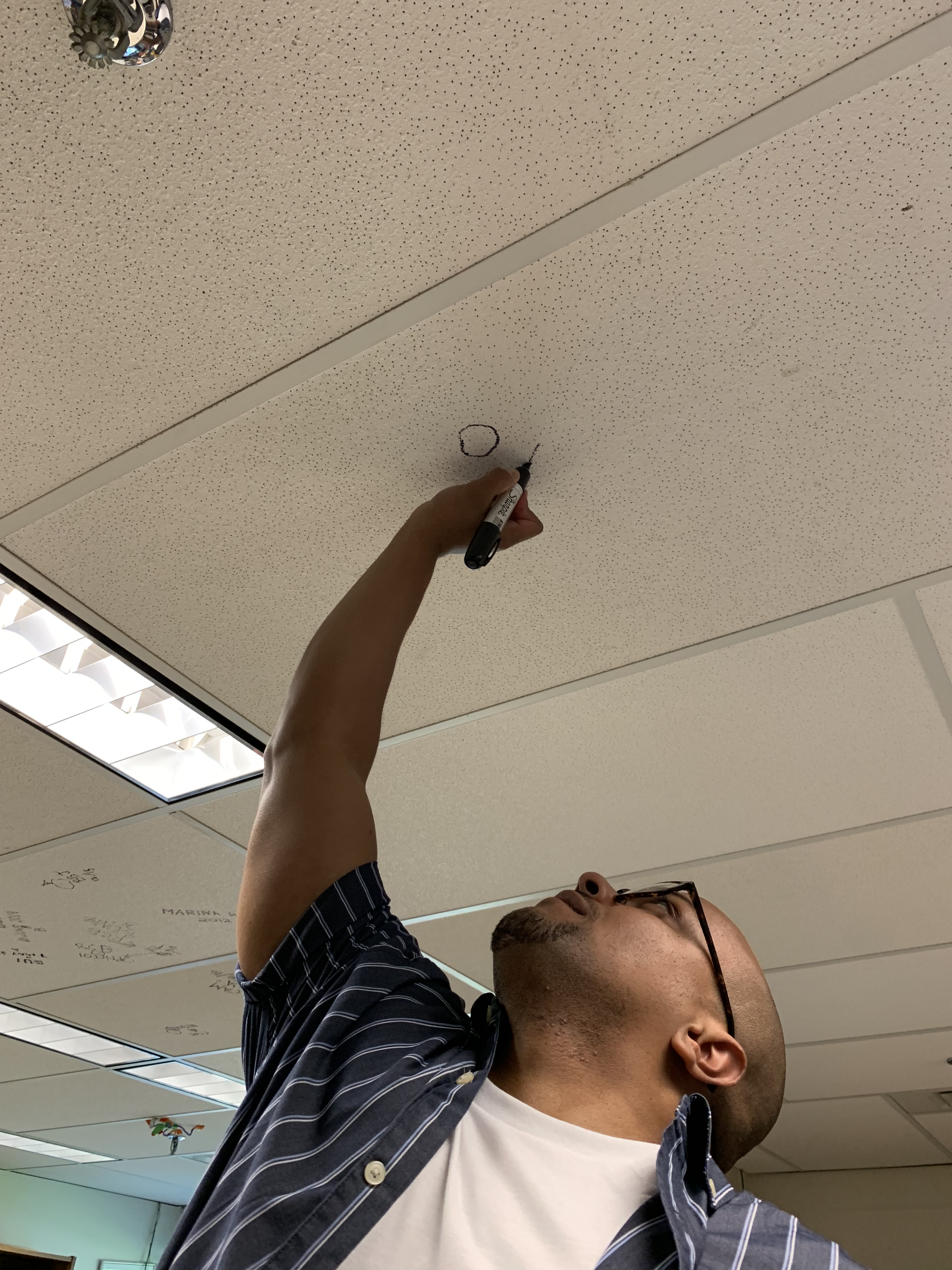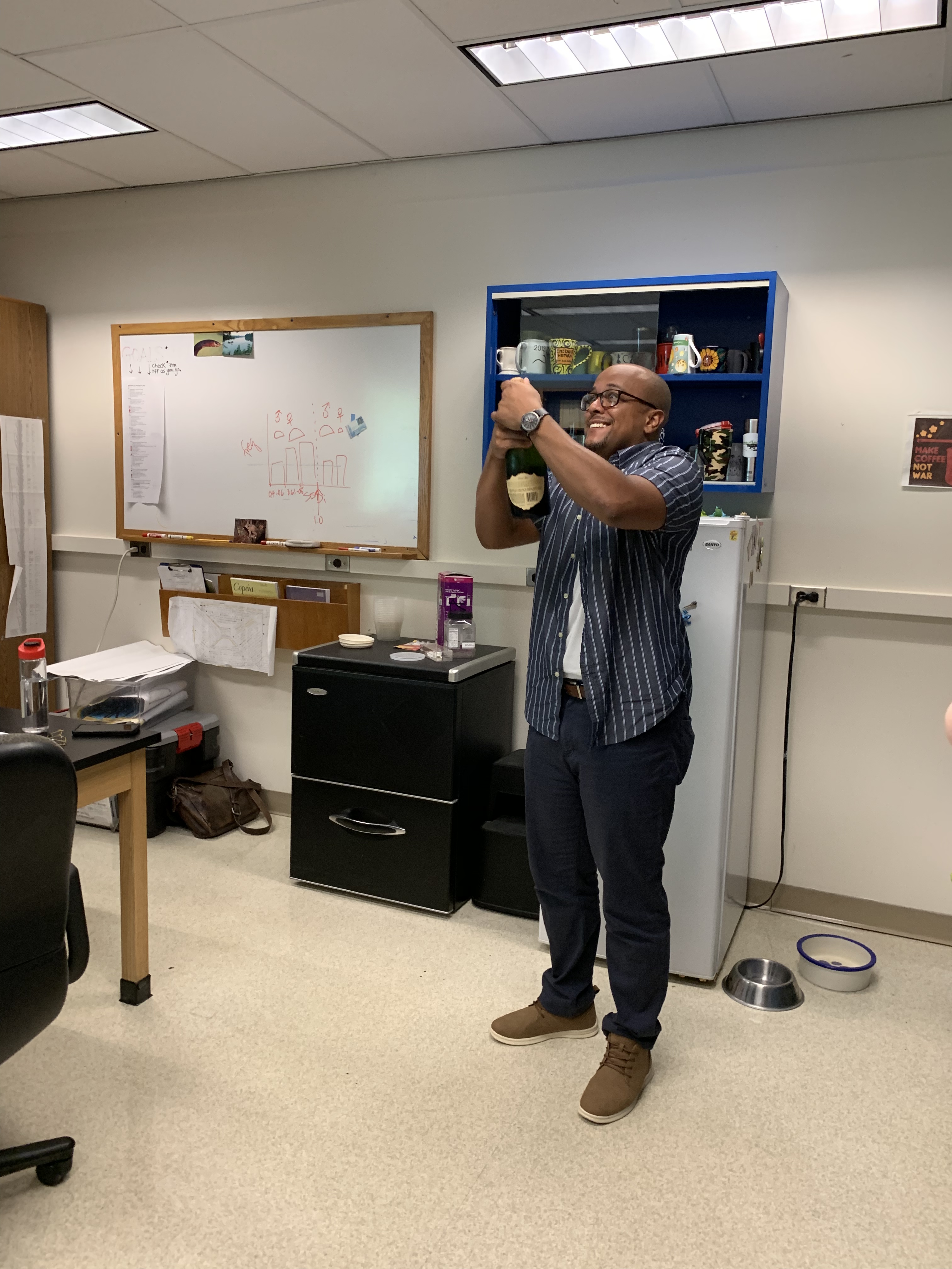 As is tradition in EEB, he dented a lab ceiling tile with a champagne cork!